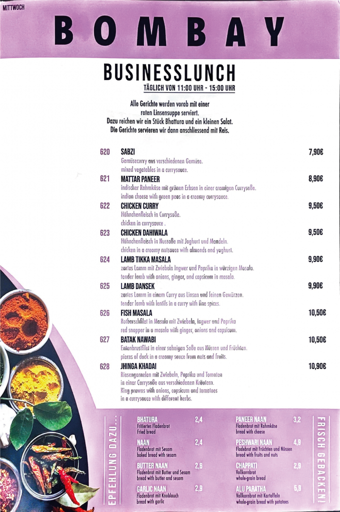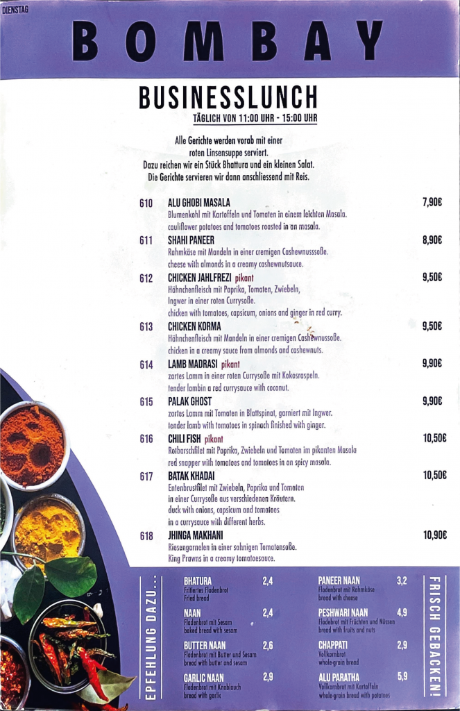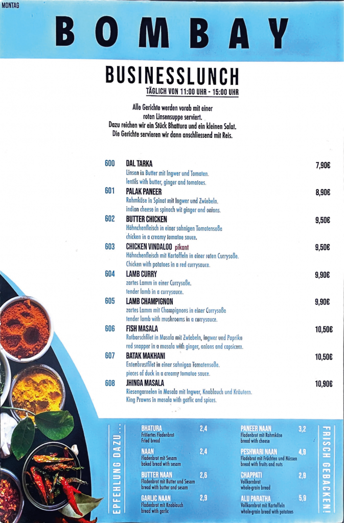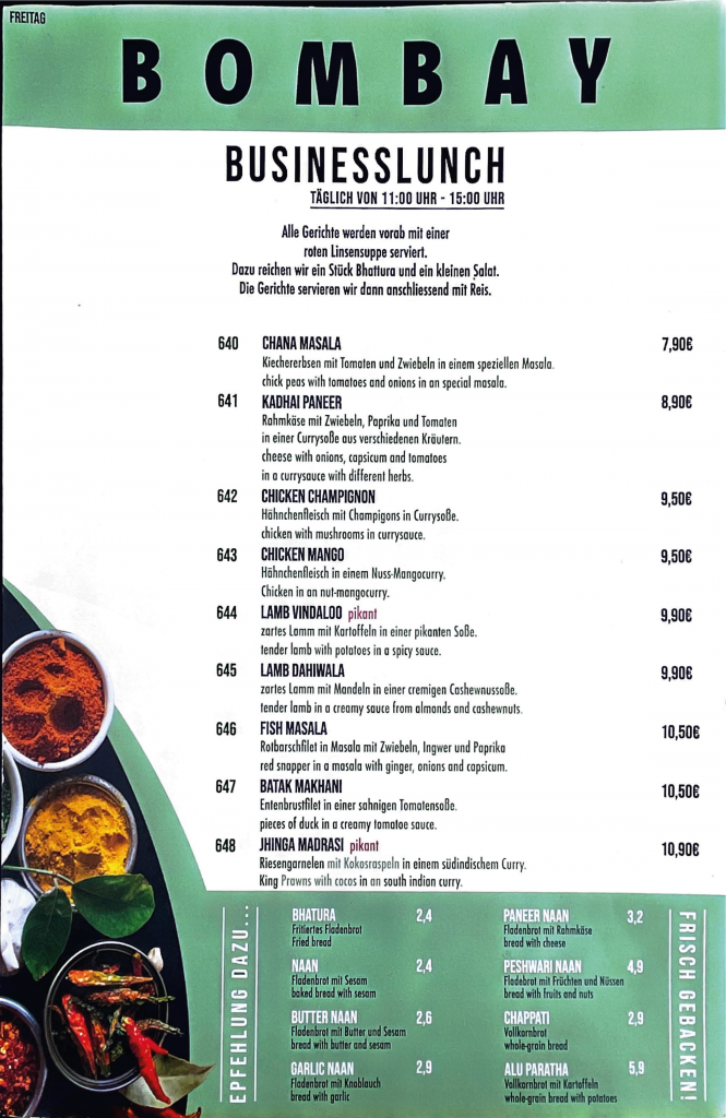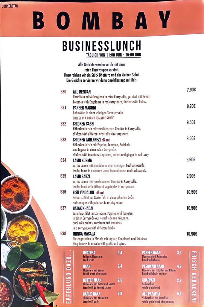 Entdecken Sie die Vielfalt der indischen Küche mit unserer täglich wechselnden Speisekarte. Von aromatischen Currys bis zu exotischen Tandoori-Gerichten – bei uns finden Sie alles, was das Herz begehrt. Lassen Sie sich von den authentischen Gewürzen und modernen Interpretationen überraschen. Unsere Business Lunch-Angebote sind von Montag bis Freitag verfügbar und bieten jeden Tag neue, frisch zubereitete Köstlichkeiten.